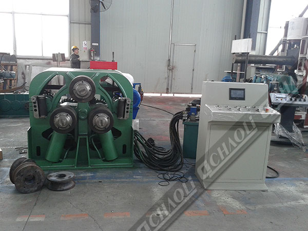此設備為較為先進型材彎曲設備,可做立式或臥式使用。更換模具可卷制各種型材及彎曲盤管。三輥均為主動輥,通過液壓馬達—齒輪傳動。設備有PLC 數(shù)控控制,帶矯正導向輥裝置,兩個側輥可圍繞固定回轉中心做弧線升降運動。